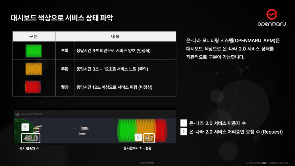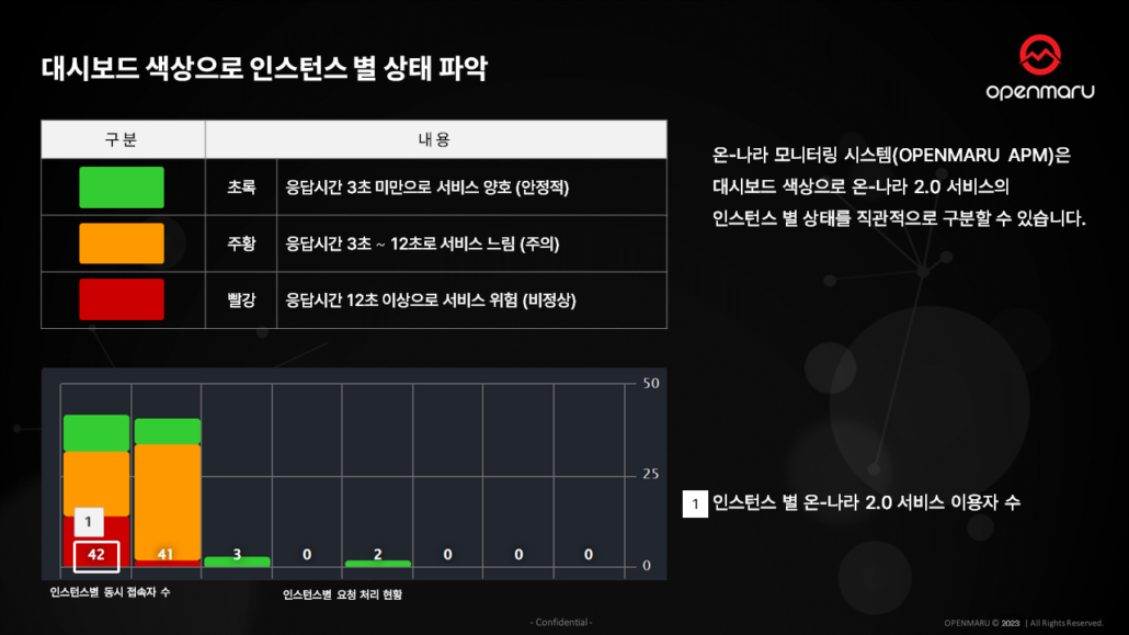 이렇게 OPENMARU APM은 서비스 상태를 한눈에 색상으로 확인 가능한데요. 간단하게 신호등 색상을 떠올리시면 됩니다.
