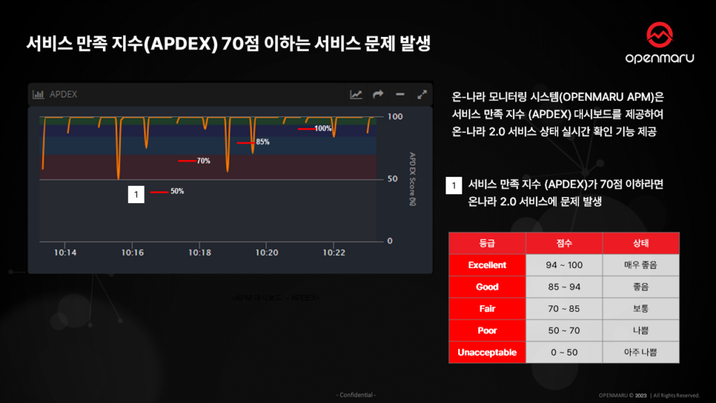 대시보드 화면의 오른쪽을 보시면 “APDEX”라는 그래프가 있습니다. 쉽게 말씀드리면 서비스 만족 지수인데요.