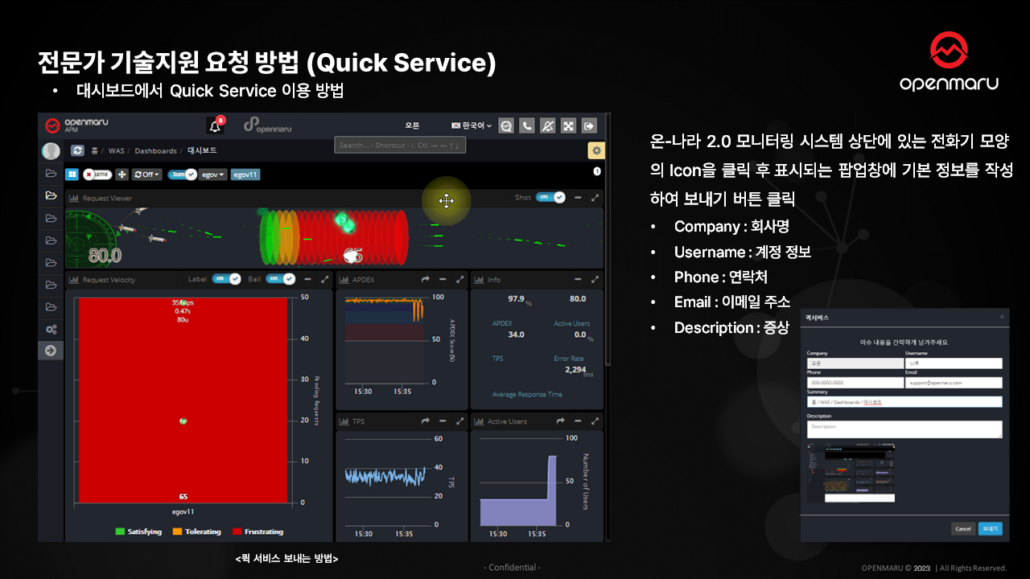 APM 대시보드 화면 위쪽에 전화기 아이콘 버튼을 누르면 기술지원 퀵서비스 요청을 보낼 수 있는데요.