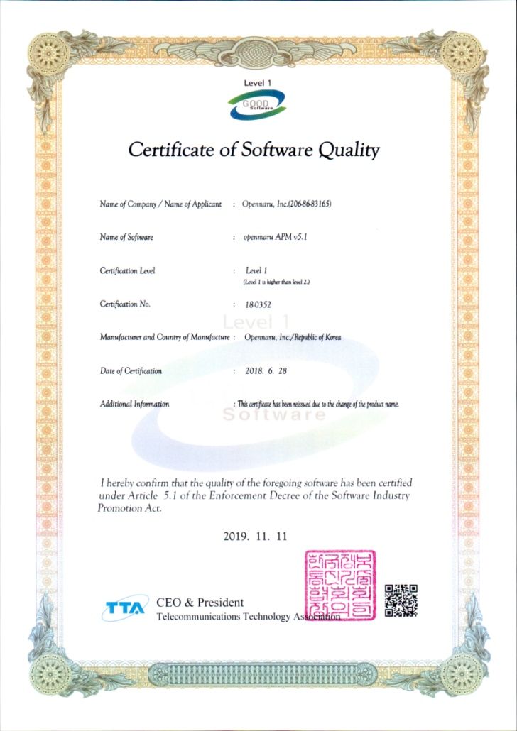 오픈나루 ( 대표 전준식)는 오픈소스 웹서버/WAS 에 최적화된 APM제품인 OPENMARU APM이 한국정보통신기술협회 (TTA)로 부터 국내 품질 우수 소프트웨어에 부여되는 굿소프트웨어 (GS) 인증 1등급을 획득했다고 밝혔다.