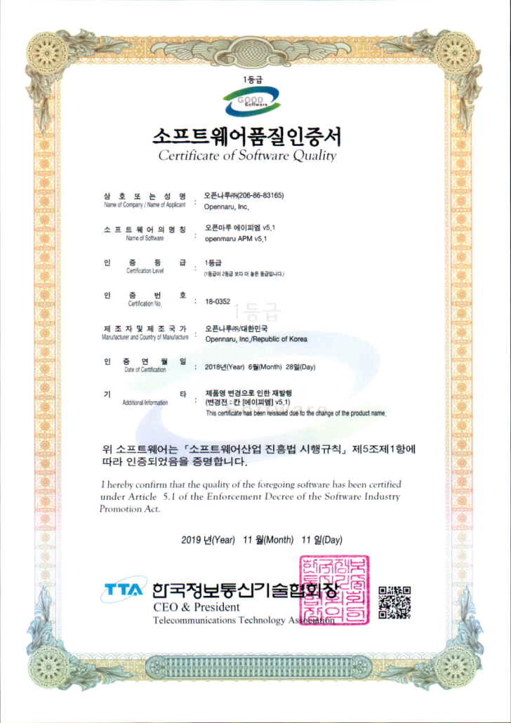 한국통신기술협회 OPENMARU APM에 대한 GS인증 페이지 – http://test.tta.or.kr/research/result/software.jsp?team_cd=S&num=4733