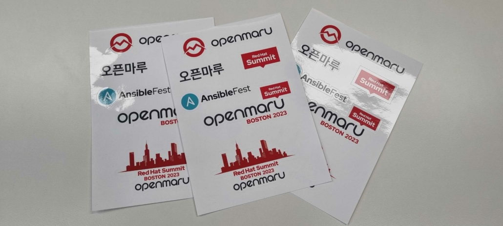 오픈마루는 ‘2023 Red Hat Summit Boston‘ 참가 기념으로, 기념 스티커를 제작하였습니다. 오픈마루에서 준비한 기념 스티커는 ‘2023 Red Hat Summit Boston‘ 현장에서 무료로 나누어 드리고 있으며, 아쉽게도 ‘2023 Red Hat Summit Boston‘에 참석하지 못하는 오픈마루 블로그 구독자 분들께, 아래 신청 페이지를 통해 선착순으로 신청하시는 20분께 우편으로 스티커 3개씩 보내드립니다.