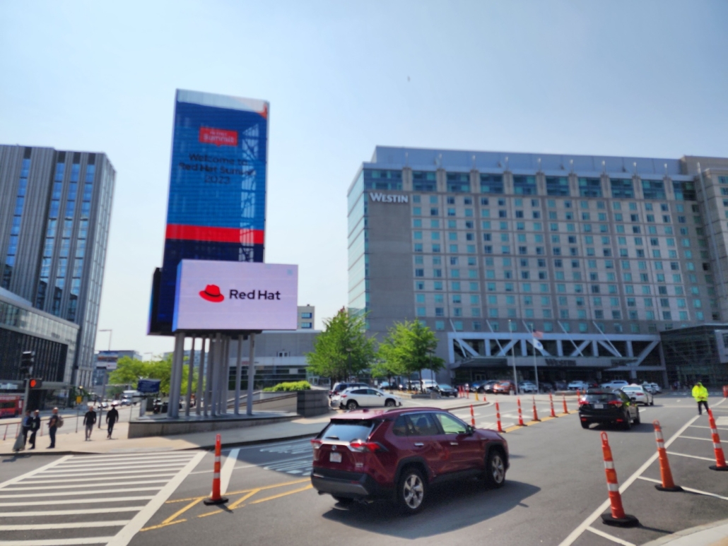 5월 23일 ‘2023 Red Hat Summit’ 첫날이 밝았습니다. 파란 하늘과, 따뜻한 햇살이 ‘Red Hat Summit 2023′에 참석한 ‘오픈마루‘를 반겨줍니다. 행사가 열리는 ‘Boston Convention and Exhibition Center‘ 밖에는 행사를 알리는 전광판이 쉴 새 없이 돌아가고 있습니다.