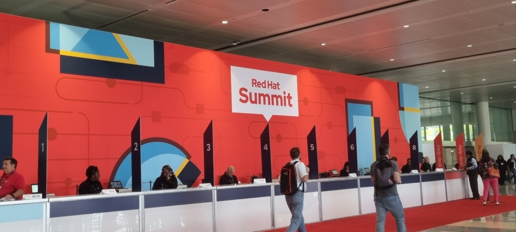 ‘Boston Convention and Exhibition Center‘ 출입문을 지나, 행사장까지 안내판이 도열하여 있습니다. 그 끝에 가면, 커다란 ‘Red Hat‘의 상징인 빨간 모자와 행사를 알리는 전광판이 보입니다.