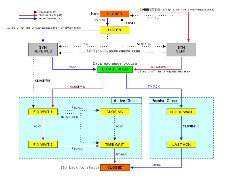 - CLOSE_WAIT, LAST_ACK, TIME_WAIT, FIN_WAIT: 비정상적인 종료 처리나 클라이언트 중단이 반복되는 경우 이 값이 급증할 수 있음