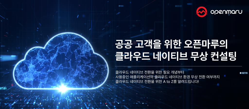 클라우드 네이티브 무상 컨설팅을 만나보세요!클라우드 네이티브 전환을 고민하고 계신가요? 공공분야 고객을 위해 준비한 오픈마루의 특별한 컨설팅! 고민에 따라, 필요에 따라 알맞은 컨설팅을 무료로 신청해보세요.