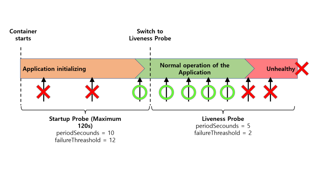 • Startup Probe : Startup Probe는 Container 가 올바르게 시작되었는지 확인하는 데 사용됩니다. Kubernetes는 시작 단계 동안 주기적으로 Health Check 요청을 Container 로 보냅니다. 준비가 되었다는 응답 코드를 수신하면 Kubernetes는 해당 Container 가 정상적으로 기동되었다고 판단합니다. 지정된 시간 초과 내에 응답을 수신하지 못하면 Kubernetes가 컨테이너를 다시 시작합니다. 이를 통해 Liveness Probe 와 마찬가지로, 신뢰성 확보에 기여합니다. 해당 Probe는 컨테이너 생성 시 동작하며, 헬스체크에 성공하면 더 이상 동작하지 않습니다.